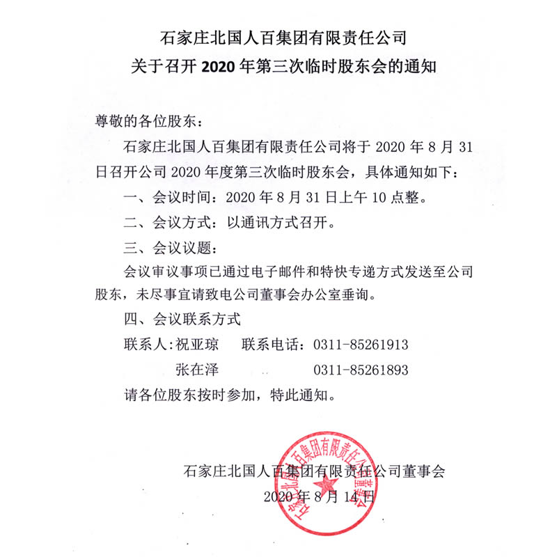 石家莊北國人百集團有限責任公司關于召開2020年第三次臨時股東會的通知