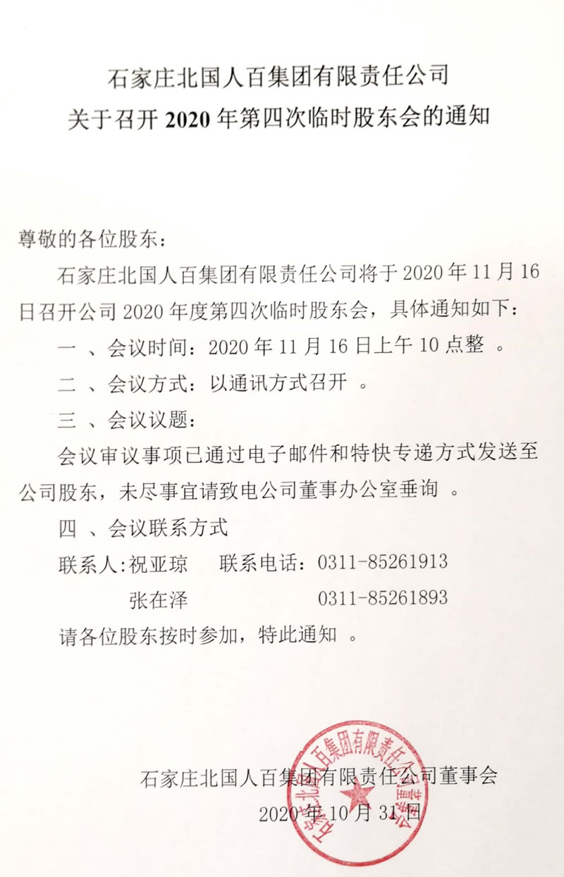 石家莊北國人百集團有限責任公司關于召開2020年第四次臨時股東會的通知