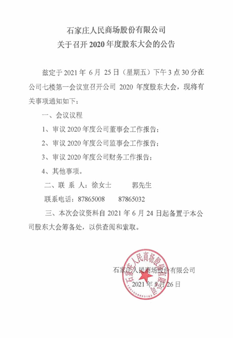石家莊人民商場股份有限公司關于召開2020年度股東大會的公告