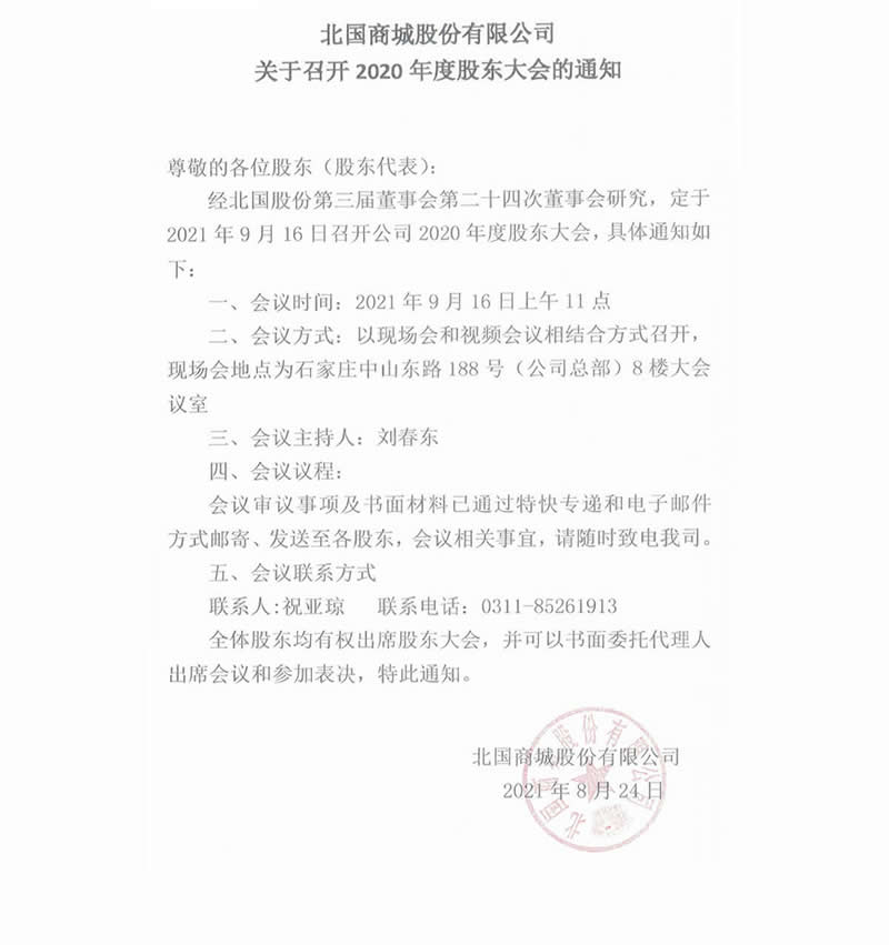 北國商城股份有限公司關于召開2020年度股東大會的通知