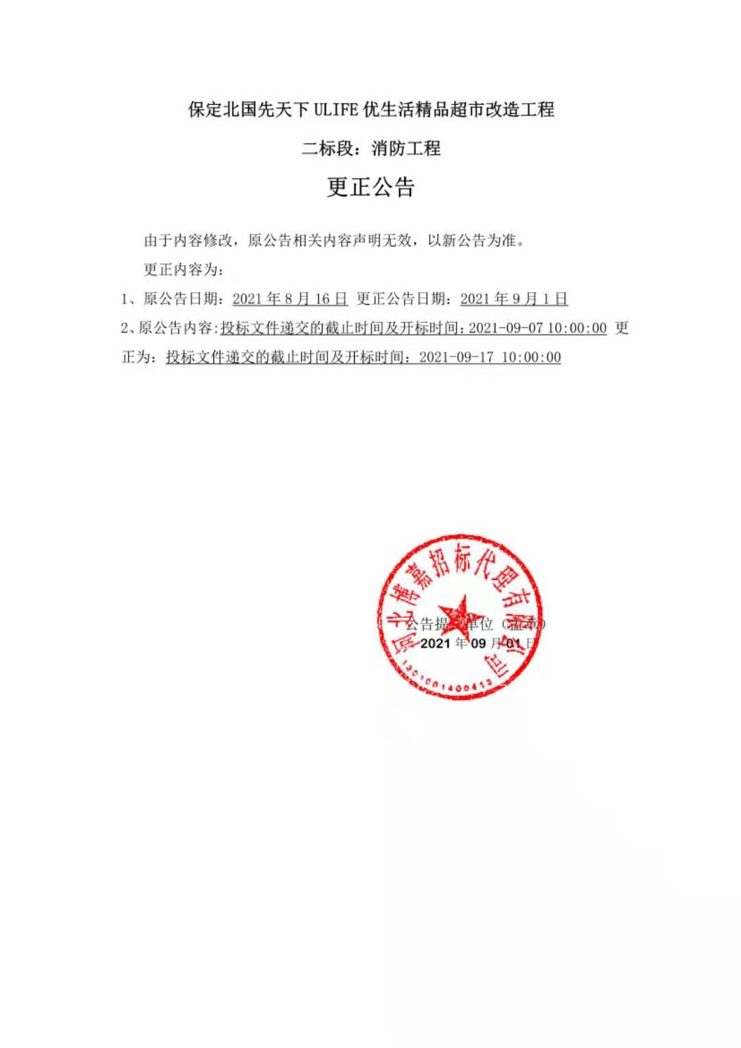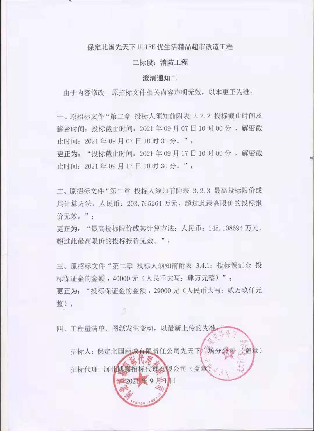 保定北國先天下ULIFE優生活精品超市改造工程招標澄清通知