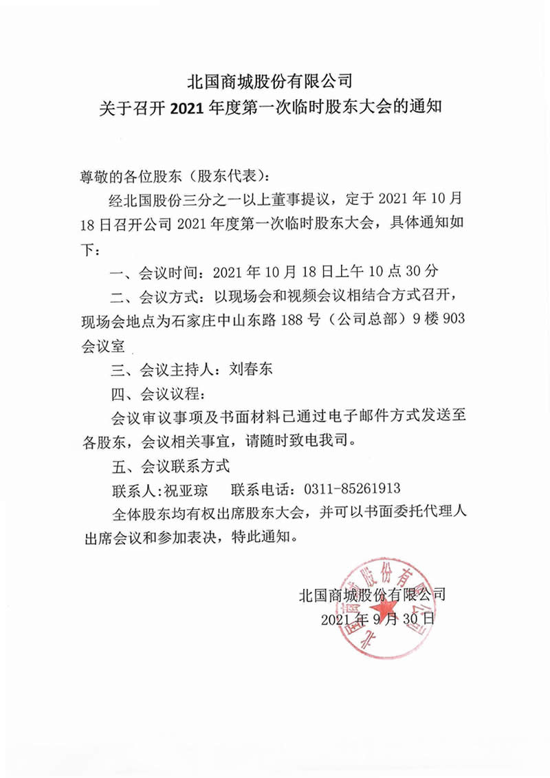 北國商城股份有限公司關于召開2021年度第一次臨時股東大會的通知