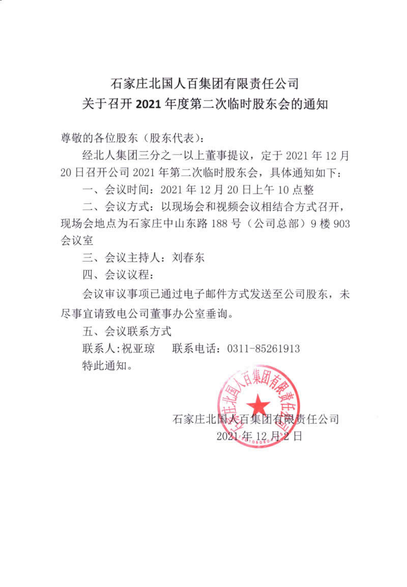 石家莊北國人百集團有限責任公司關于召開2021年度第二次臨時股東會的通知