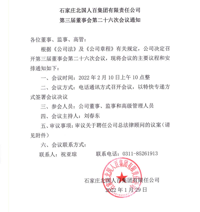 石家莊北國人百集團有限責任公司第三屆董事會第二十六次會議通知