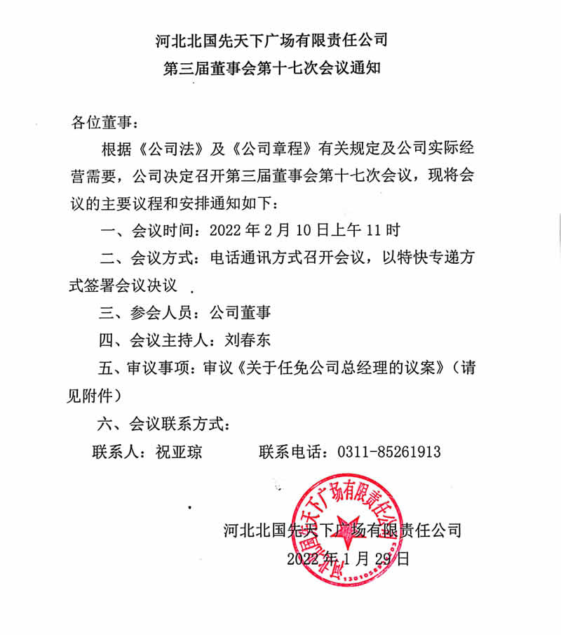河北北國先天下廣場有限責任公司第三屆董事會第十七次會議通知