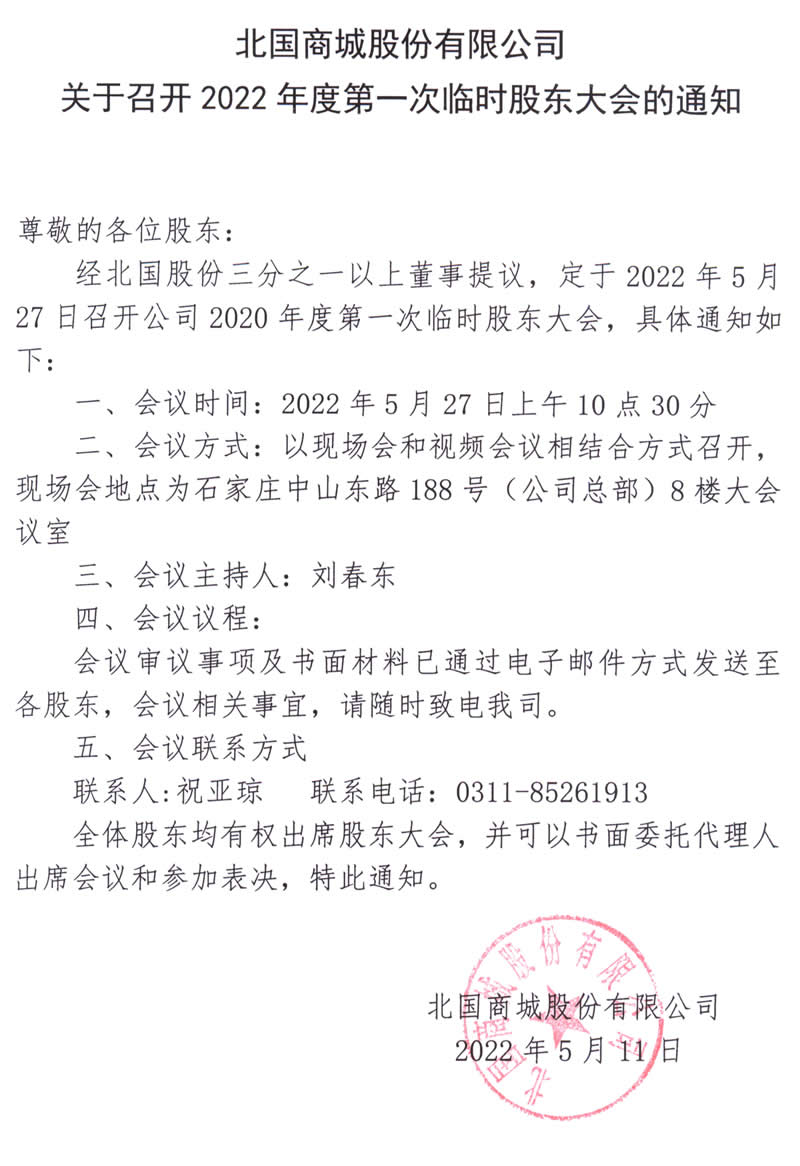 北國商城股份有限公司關于召開2022年度第一次臨時股東大會的通知