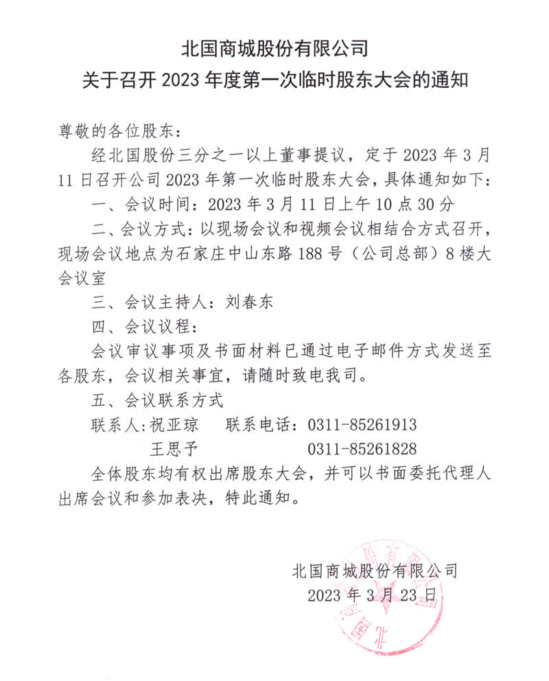 北國商城股份有限公司關于召開2023年度第一次臨時股東大會的通知