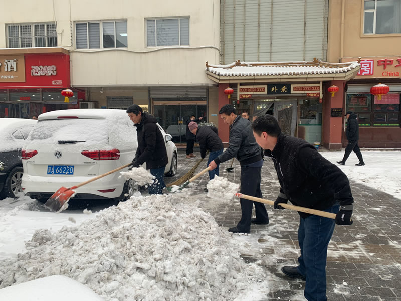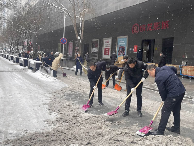 清雪現場,集團黨員干部職工不顧嚴寒、相互配合,齊心協力清理道路上的冰雪,助力市民出行便利、順暢。