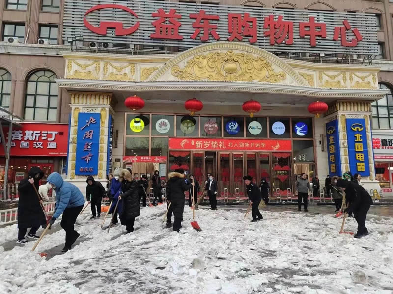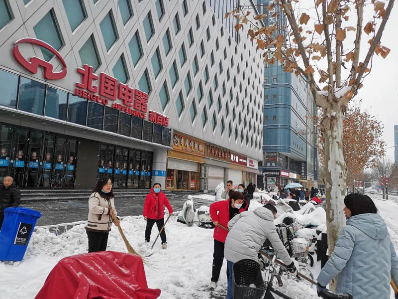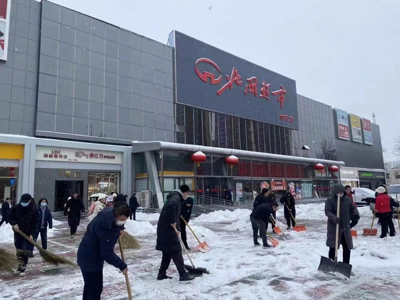 2月20日至21日,石家莊普降大雪,給市民出行、消費者購物帶來了諸多不便。北人集團旗下各賣場認真履行“門前三包”義務,組織干部員工及時清理門前積雪和殘冰,保障門店前道路通暢、行人安全出行。
