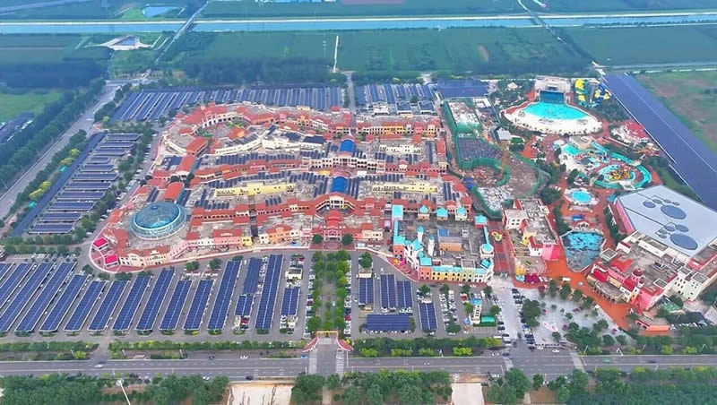項目以高標準車棚為基礎,頂部鋪設高效率單晶硅光伏組件,數千塊深色光伏板整齊列陣,高效轉化太陽能為綠色電力,既解決了傳統停車場功能單一的問題,又為北國奧萊小鎮構筑起守護可持續發展的“能源方舟”,自投入運營以來,帶來了可觀的經濟效益及環境效益。據統計,奧萊項目年發電量約900萬度,發電自用率達85%,可直接滿足園區內品牌店鋪、照明系統、空調系統及公共設施的用電需求,相當于2500戶城市家庭一年的用電量,年節約費用約120萬元;水世界項目年發電量約800萬度,年節約費用約35萬元。