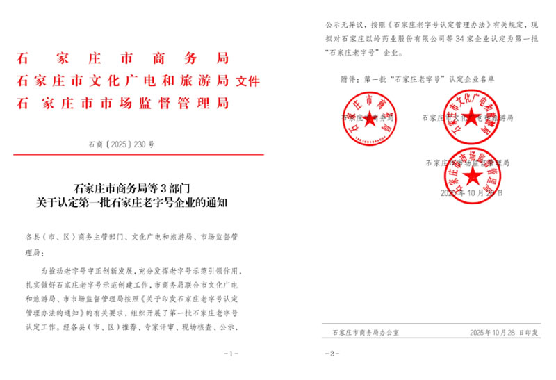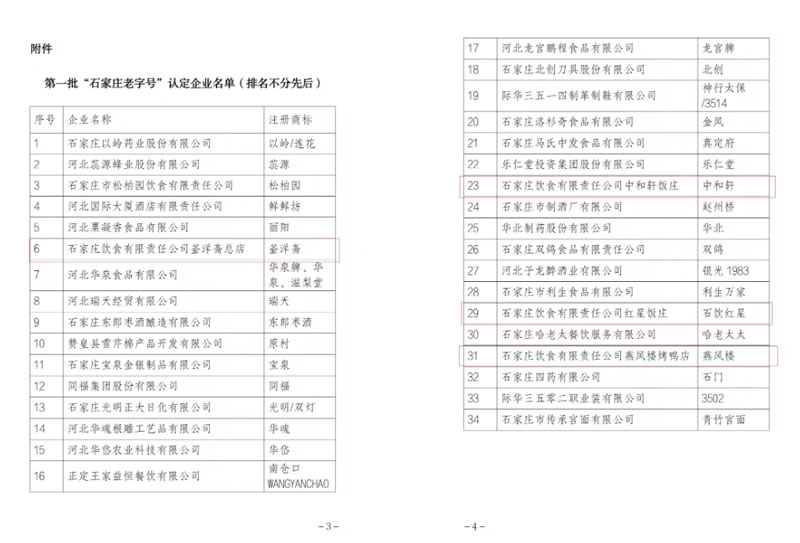 為進一步推動老字號守正創新發展,石家莊市商務局、市文化廣電和旅游局、市市場監督管理局聯合開展了石家莊老字號認定工作。經各縣(市、區)推薦、專家評審、現場核查、公示等,認定34家企業為首批石家莊老字號,石家莊飲食有限責任公司中和軒飯莊、燕風樓烤鴨店、紅星飯莊、釜洋齋總店四家餐飲企業成功入選。